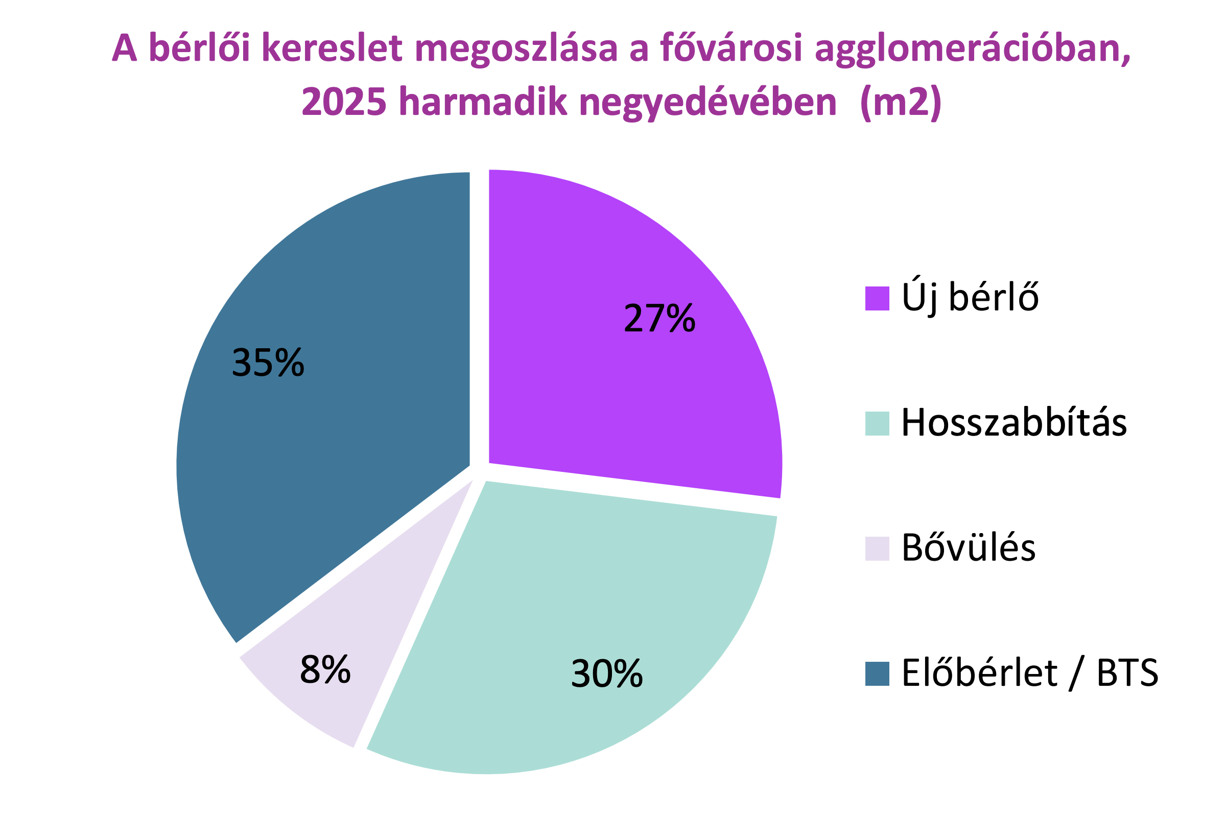 2025 harmadik negyedévében Budapest és környékének piacán az új szerződések a teljes kereslet 27%-át tették ki, míg a szerződéshosszabbítások 30%-os arányban járultak hozzá a teljes volumenhez. A bővülések 8%-ot képviseltek, az előbérleti szerződések pedig 35%-ot tettek ki.