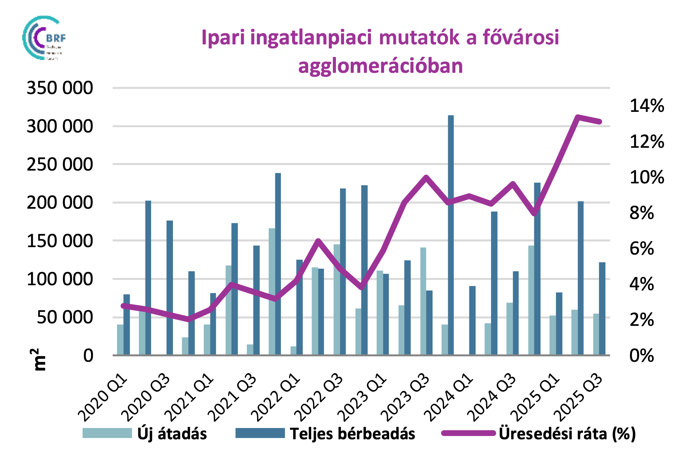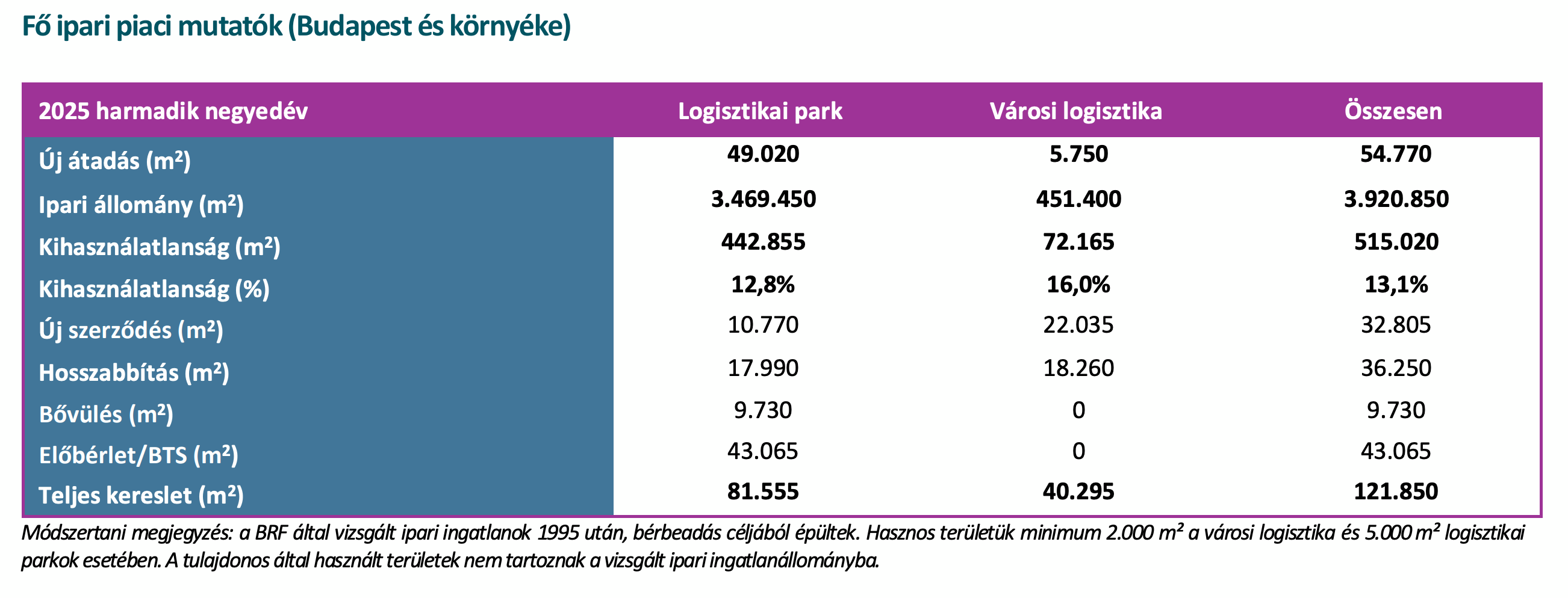 2025 harmadik negyedév végén a teljes országos modern ipari/logisztikai állomány 5.923.790 m²-t tett ki, mely az előző negyedévhez képest enyhe növekedést jelent az új átadások, meglévő épületek állományba kerülése, valamint a méretkorrekciók miatt. Ebből a fővárosban és környékén található 3.920.850 m², míg a regionális hazai állomány 2.002.940 m²-t tett ki.
